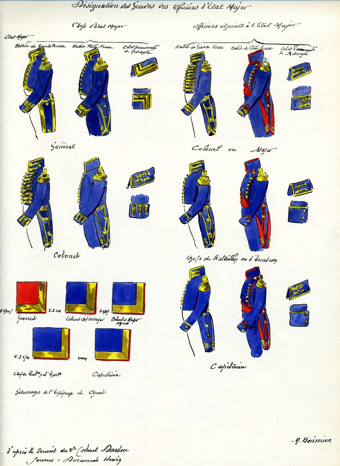Zusätzlich könnten diese Überlegungen Indizien für die endgültige Einordnung der "Adjutanten des Generalstabs" in der Dresdner Bilderhandschrift bieten. Bommer stellt dieselbe Personengruppe nämlich in großer Uniform mit Goldstickerei, jedoch ohne Paspelierung dar, in der kleinen Variante ohne Stickerei aber mit roter Paspelierung. Daraus könnte man schließen, dass die übliche kleine Uniform der Adjoints sogar in mehreren französisch-alliierten Armeen ganz dunkelblau mit roter Paspelierung war. Zusätzlich haben wir auch noch mehrere unterschiedliche Varianten des Schnitts der Rockvorderseite.